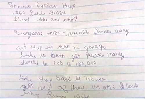 Trong túi quần Louis, cảnh sát t́m được 900 USD tiền mặt cùng mẩu giấy viết tay với hướng dẫn "bắt cóc Pamela, lấy tiền của Russel từ ngân hàng rồi giết người diệt khẩu", và "hăy giết Pamela như đă giết vợ của Russel, cắm dao vào cổ". Mảnh giấy c̣n nói Louis sẽ được nhận 10.000 USD tiền công. Các vật chứng trên có vẻ như cho thấy kẻ đột nhập có quan hệ với Russel.