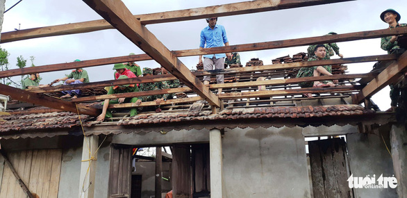 Cơn lốc xoáy càn quét nhiều nhà dân ở xã Kỳ Hoa, thị xã Kỳ Anh, Hà Tĩnh. Người dân đang lợp lại nhà sau trận lốc. Nhìn cảnh nhà cửa gạch ngói, nhiều tài sản bị hư hỏng khiến họ không kìm nổi nước mắt.
