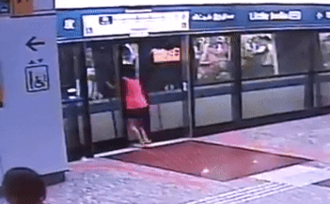 Dẫu cánh cửa đã đóng sầm lại, nữ hành khách này vẫn cố gắng bước vào bên trong toa nhưng không thể nên mắc kẹt giữa hai cánh cửa.