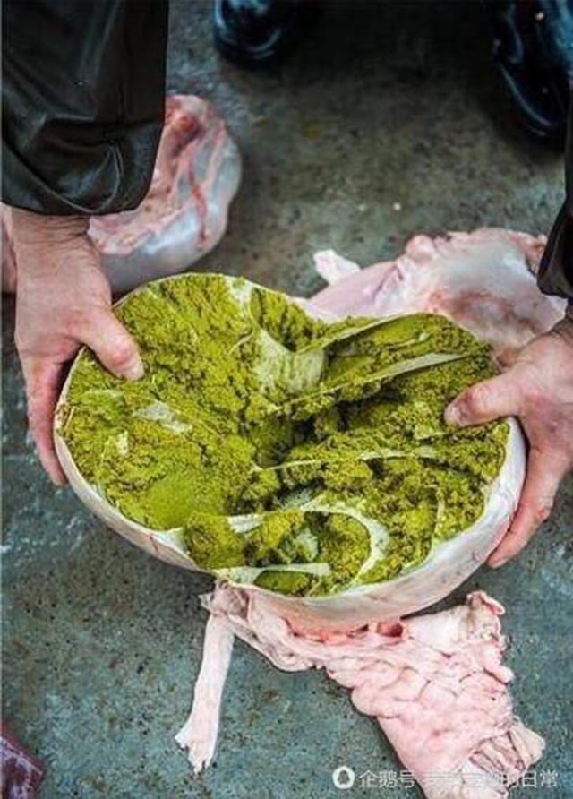 Sau khi giết mổ bò, người dân địa phương sẽ lấy bã thức ăn trong ruột và dạ dày bò chưa được tiêu hóa hoàn toàn, sau đó vắt lấy chất lỏng. Thứ nước màu xanh này chính là các loại cỏ chưa được tiêu hóa. Đây là thứ nước mà người dân Vân Nam tin rằng nó có hương vị đặc biệt, không thể so sánh với các loại nước ép rau củ bình thường.