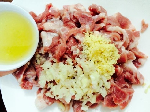Bước 1: Thịt nạc vai sơ chế sạch thái miếng thật mỏng, bản dài. Hành khô, tỏi bóc vỏ băm nhỏ.