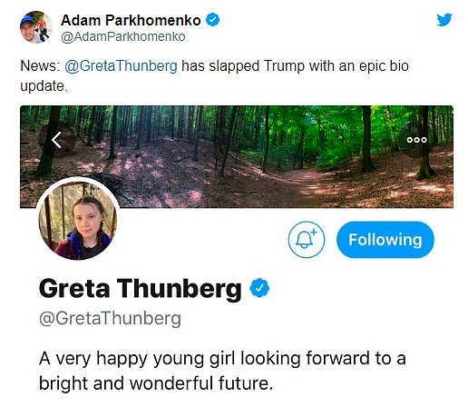 Thunberg không bình luận về nhận xét trên mà trực tiếp trích dẫn nó vào trong tiểu sử Twitter của mình, mô tả bản thân là “một cô gái bé nhỏ mong chờ một tương lai tươi sáng và tuyệt vời”.