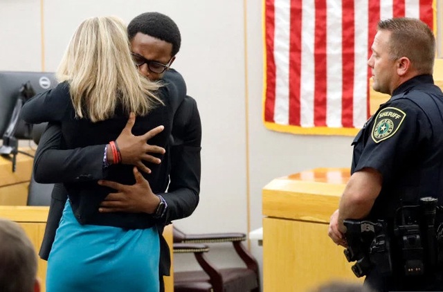 Khoảnh khắc bất ngờ trên diễn ra trong phiên tòa xét xử Amber Guyger về tội sát hại người hàng xóm Botham Jean tại tòa án quận Dallas, bang Texas (Mỹ). Guyger, 31 tuổi, cựu cảnh sát Dallas, đã bị buộc tội sát hại Jean, 26 tuổi, vào đêm ngày 6/9/2018 sau khi vào nhầm căn hộ nhà anh này mà cô tưởng là nhà mình và nghĩ rằng Jean là kẻ đột nhập.
