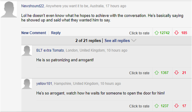 Nhiều người dùng mạng đă bức xúc trước hành động của Hoàng tử Harry đối với nữ phóng viên. Họ cho rằng, chồng của Meghan Markle cư xử thật thô lỗ và ngạo mạn. Khi anh mời phóng viên đến đưa tin, họ có quyền đặt ra câu hỏi. Nữ phóng viên Rhiannon hoàn toàn đưa ra những câu hỏi đúng trọng tâm của vấn đề, không xâm phạm quyền riêng tư cá nhân.