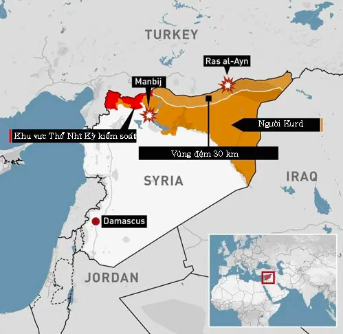 Khu vực kiểm soát của Thổ Nhĩ Kỳ và người Kurd ở đông bắc Syria. Bấm vào ảnh để xem chi tiết. Đồ họa: CBS.