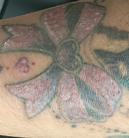 Anh Hà 25 tuổi, cuối tháng 10 đến Bệnh viện Da liễu TP HCM khám trong tình trạng vết xăm hình ở cánh tay phải bị sưng, vùng da xăm bị rộp nước, đau và ngứa, sốt... Bác sĩ chẩn đoán anh bị nhiễm trùng do xăm hình.