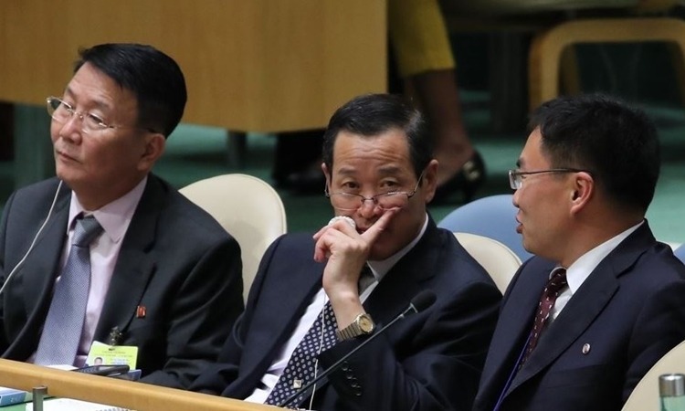 Các nhà ngoại giao Triều Tiên tại phiên họp Đại hội đồng Liên Hợp Quốc ở New York hồi tháng 9/2018. Ảnh: Yonhap.