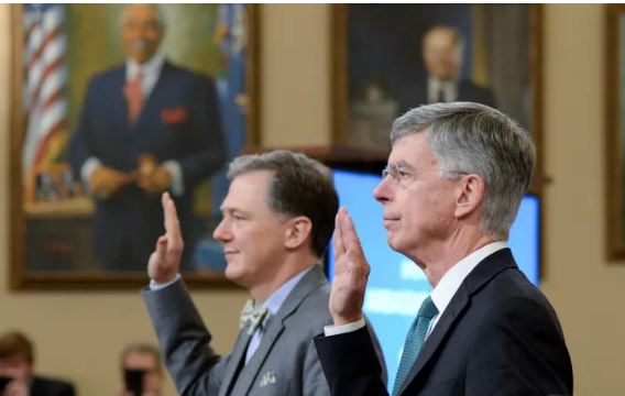 Hai ông Bill Taylor, quyền Đại sứ Mỹ tại Ukraine (phải) và George Kent, phó trợ lư Ngoại trưởng Mỹ tại cuộc điều trần công khai hôm 13-11 Ảnh: Reuters