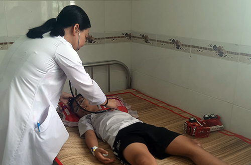 Bác sĩ đang kiểm tra sức khoẻ một trong bốn bệnh nhi. Ảnh: Cửu Long.