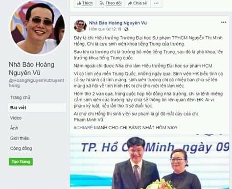 Sự việc xảy ra hôm 19/11, xuất phát từ b́nh luận của một bạn sinh viên tên H khoa tiếng Trung ( ảnh đính kèm ) với nội dung là " trường ... cấm chia sẻ thông tin về Hongkong. Và cảm thấy xấu hổ khi là sinh viên Việt Nam". Và b́nh luận của bạn đấy ngay lập tức lọt vào " mắt xanh " của các anh chị em dân chủ. Họ chụp b́nh luận đó và lan truyền trên fb với nội dung là : " Hiệu trưởng Nguyễn Thị Minh Hồng ra quyết định cấm sinh viên chia sẻ thông tin về Hongkong ". Thậm chí có người c̣n tung tin khẳng định rằng : "Hiệu trưởng ĐHSP đă tổ chức họp hội đồng vào hôm thứ 2 và mời sinh viên lên làm việc.". Quan ngại hơn, có những người c̣n chỉ trích Hiệu trưởng bằng những từ ngữ thô thiển, xúc phạm nghiêm trọng tới danh dự của cô. Trong khi trước hôm 19/11 cô không ban hành bất cứ quyết định nào như các bài viết lan truyền trên mạng xă hội.
