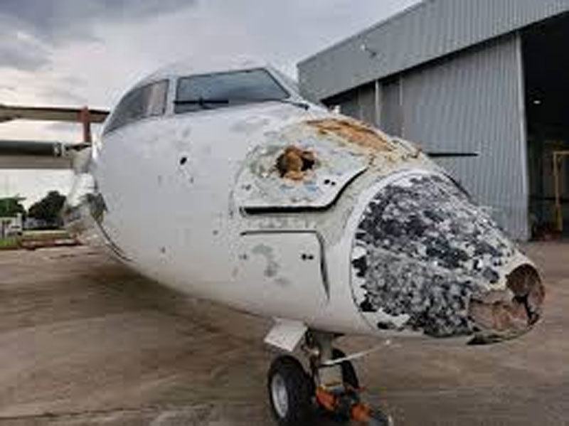 Hình ảnh máy bay sau khi hạ cánh an toàn cho thấy nhiều lỗ hổng lớn trên mũi máy bay hình nón. Phần trước còn bị tróc hết vỏ. Đầu mũi bị rách toang. Kính buồng lái bị nứt.
