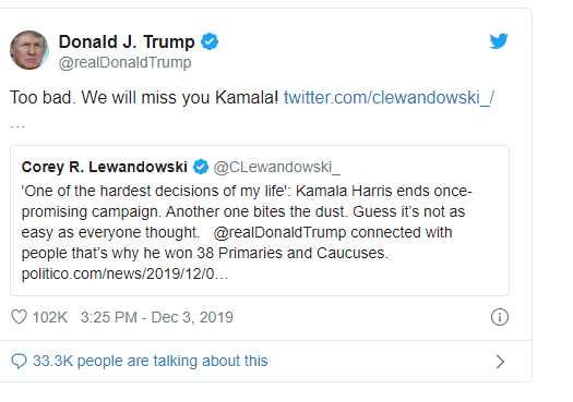 Ông Trump đăng lại mẩu tweet từ cựu Giám đốc vận động tranh cử, và là bình luận viên chính trị Corey Lewandowski, kèm theo lời nói móc. “Quá tệ. Chúng tôi sẽ nhớ bà, Kamala.”