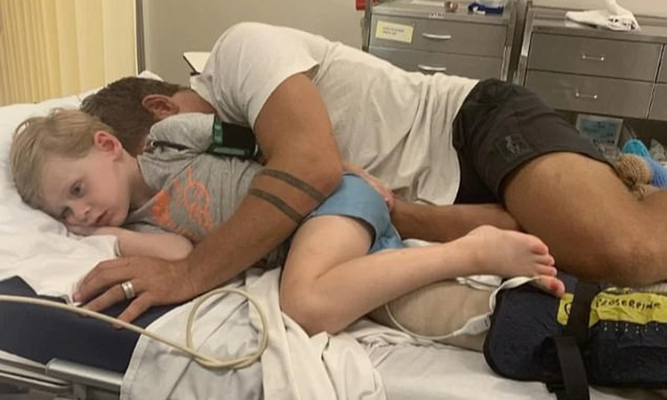 Thompson ôm con trai tại bệnh viện, nơi bé được điều trị sau vụ trăn tấn công. Ảnh: Facebook/ Evan Thompson.