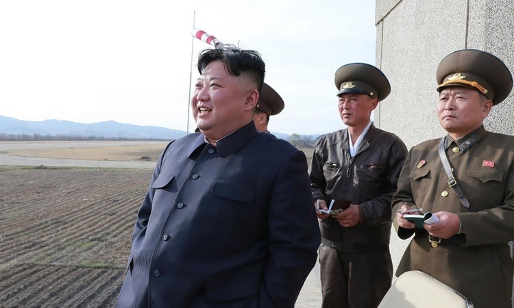 Lănh đạo Triều Tiên Kim Jong-un thị sát một cuộc tập trận không quân hồi tháng 4. Ảnh: AFP.