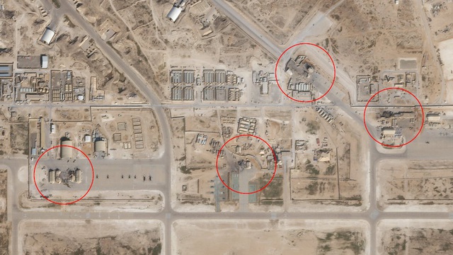Ảnh vệ tinh cho thấy một số cấu trúc trong căn cứ al-Asad hư hại hoặc bị phá hủy hoàn toàn sau cuộc tấn công của Iran sáng 8/1. (Ảnh: NPR)
