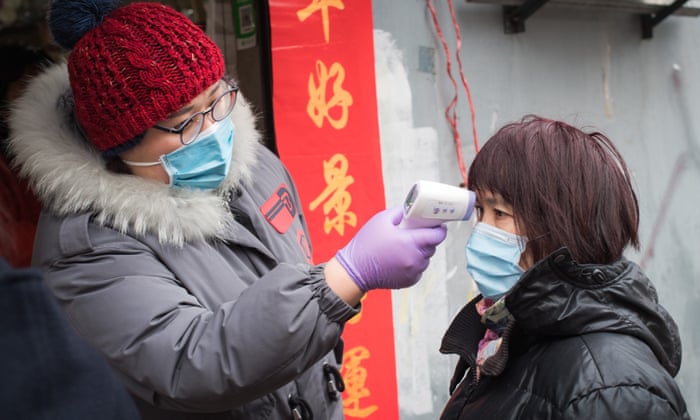 Kiểm tra thân nhiệt một cư dân thành phố Vũ Hán, tỉnh Hồ Bắc, Trung Quốc ngày 7/2. Ảnh: Xinhua.