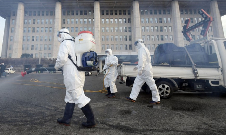 Nhân viên y tế phun khử trùng tại ṭa nhà quốc hội Hàn Quốc hôm 24/2. Ảnh: AFP.