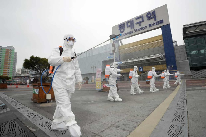 Phun khử trùng tại Daegu để ngăn chặn lây lan virus corona. Ảnh: Yonhap.