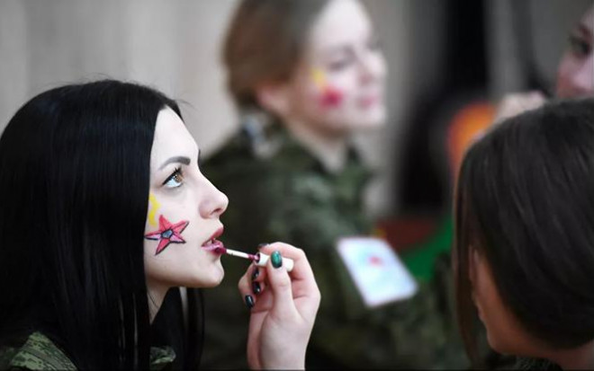 "Trang điểm dưới lớp ngụy trang"- một cuộc thi đặc biệt dành cho 50 nữ quân nhân đến từ khắp nước Nga vào dịp ngày Quốc tế phụ nữ 8/3 đến gần. Ảnh: Sputnik