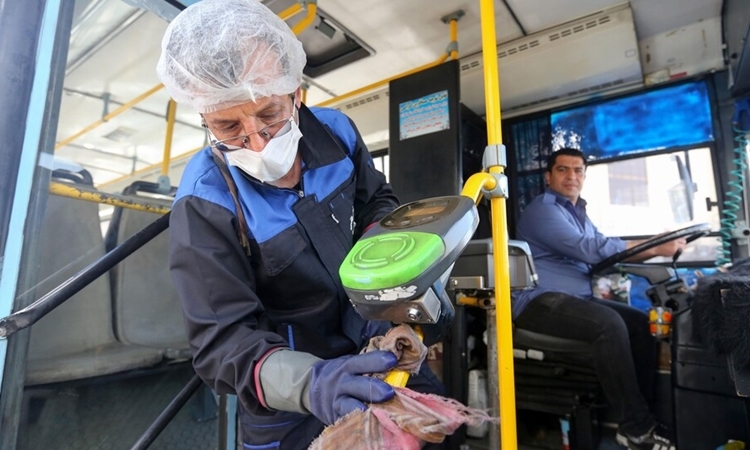 Nhân viên vệ sinh công cộng làm sạch xe bus ở Tehran ngày 10/3. Ảnh: Reuters.