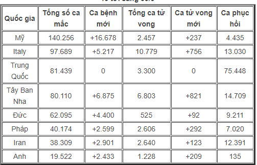 Đại dịch COVID-19 hiện đă lan tới 199 quốc gia và vùng lănh thổ. Các nước cũng ghi nhận 150.918 trường hợp phục hồi sức khỏe. Mỹ, Italy, Trung Quốc, Nhật Bản, Đức, Pháp, Iran và Anh là những nước chịu hậu quả nặng nề nhất của dịch bệnh chết người đang làm chao đảo thế giới này.