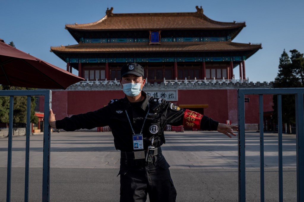 Nhân viên bảo vệ đóng cổng bên ngoài di tích Cố Cung ở Bắc Kinh hôm 12/4. Ảnh: AFP.