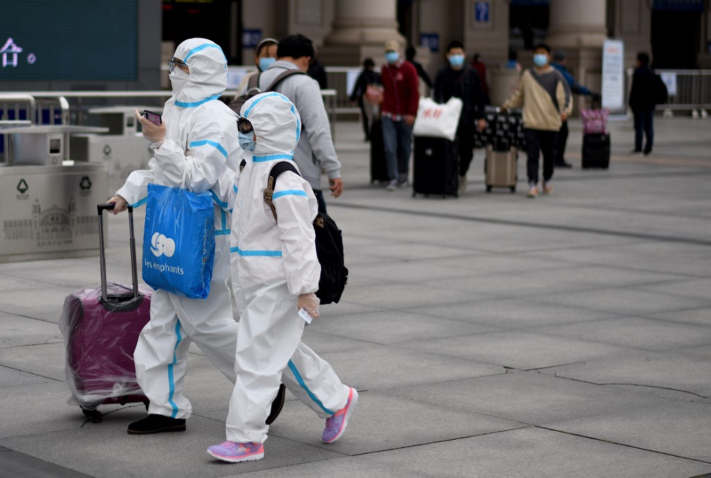 Hành khách mặc đồ bảo hộ toàn thân tại ga đường sắt Hán Khẩu ở Vũ Hán hôm 11/4. Ảnh: AFP.