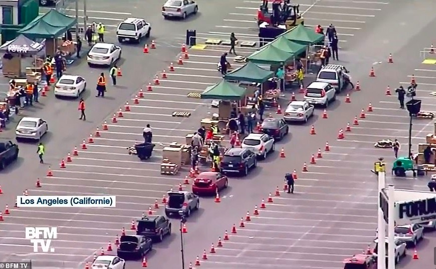 Theo Daily Mail, hàng nghìn chiếc ô tô được phát hiện bò chầm chậm dọc một con phố ở khu vực The Forum, Inglewood để nhận các món thực phẩm do Ngân hàng lương thực vùng Los Angeles cung cấp.