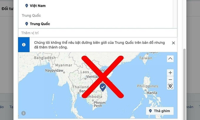 Mới đây Facebook đă đăng h́nh bản đồ Việt Nam nhưng xóa mất Trường Sa và Hoàng Sa. Trong phần thiết lập chạy quảng cáo của Facebook, hai quần đảo Trường Sa, Hoàng Sa bị xoá khỏi bản đồ Việt Nam và gộp vào đường biên giới Trung Quốc.