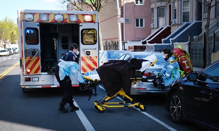 Nhân viên y tế Mỹ đưa bệnh nhân Covid-19 lên xe cứu thương ở Brooklyn, New York hôm 11/4. Ảnh: AFP.
