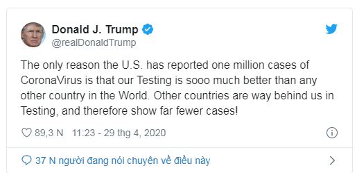 Ông Trump viết: "Lý do duy nhất Mỹ có 1 triệu ca nhiễm COVID-19 là do năng lực xét nghiệm của chúng ta tốt hơn các nước khác rấttttt nhiều".