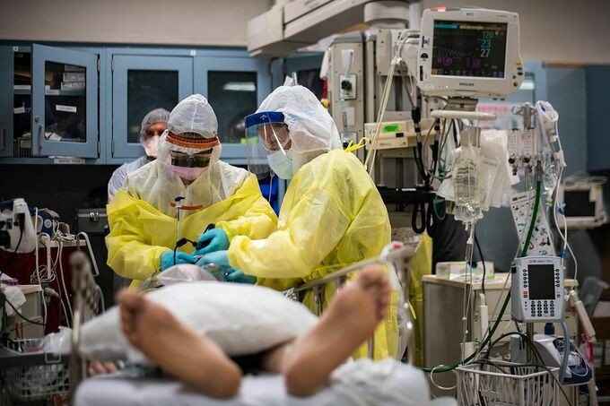 Bác sĩ tại Trung tâm Y tế Maimonides, Mỹ, tiến hành đặt nội khí quản cho bệnh nhân Covid-19. Ảnh: WSJ