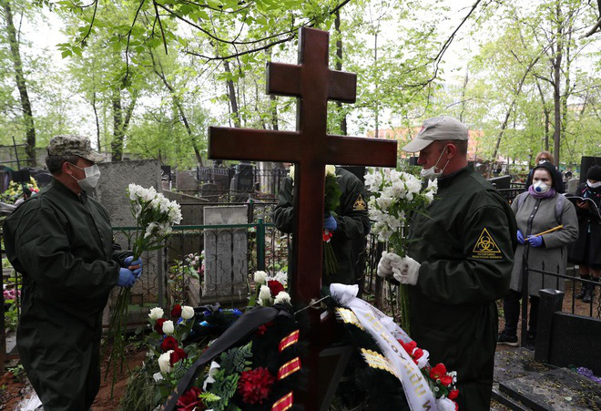 Người thăm viếng tại nơi chôn cất mục sư Andrei Molchanov, 54 tuổi, ở Nga vào ngày 9-5. Ông Molchanov chết vì nhiễm Covid-19. Ảnh: Reuters
