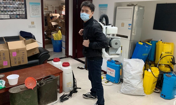 Lư Tuấn Khanh thử thiết bị khử trùng tại công ty Khương Duy ở Vũ Hán. Ảnh: WSJ.