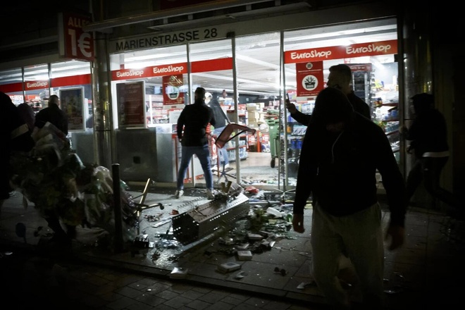 Tổng cộng, 9 cửa tiệm bị hôi của và 14 tiệm khác bị hư hại như vỡ kính. Ảnh: dpa.