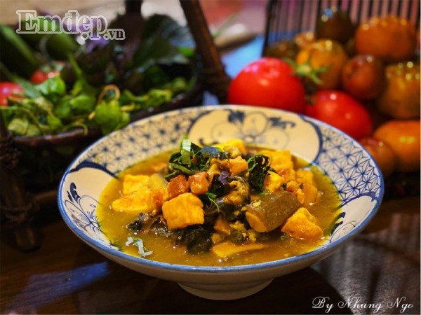 Cà chua rửa sạch, cắt múi cau. Tía tô, lá lốt, hành lá rửa sạch, cắt nhỏ. Nghệ tươi cạo vỏ, rửa sạch, giã nhỏ lọc lấy nước.