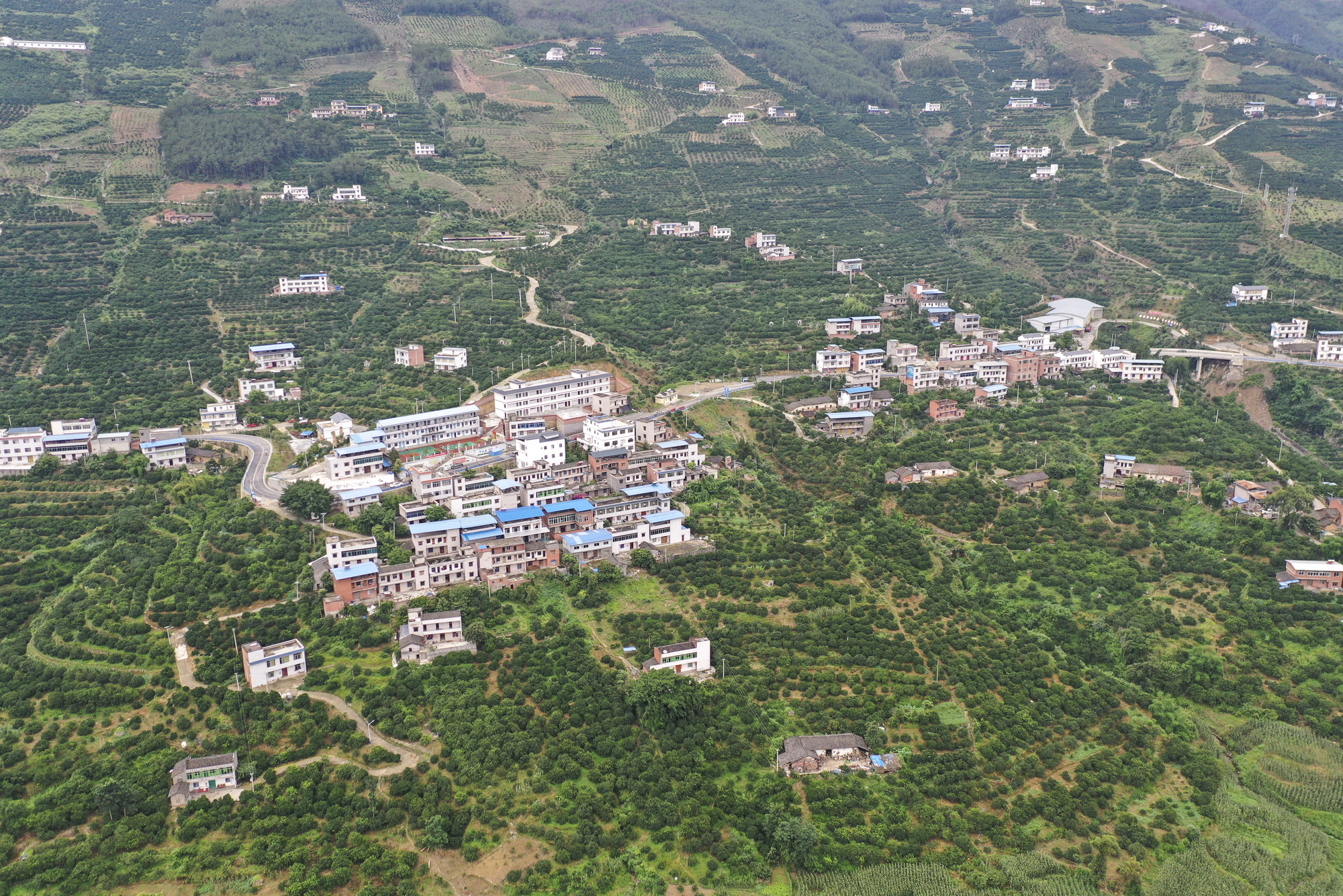 Ảnh chụp trên không vào ngày 19/6/2020 cho thấy những vườn cam bao quanh ngôi làng Santuo, huyện Fengjie, phía tây nam thành phố Trùng Khánh.