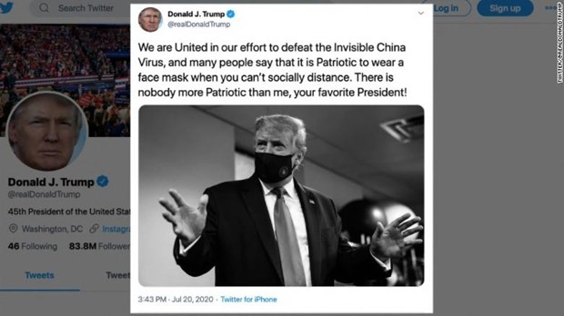 Ngày 20/7, Tổng thống Trump tiếp tục gây bất ngờ khi lên tiếng kêu gọi người dân đeo khẩu trang để pḥng chống dịch. Trên mạng Twitter, ông Trump viết: "Nhiều người nói rằng đeo khẩu trang khi không thể duy tŕ giăn cách xă hội là một hành động yêu nước. Chẳng có ai yêu nước như tôi, vị tổng thống ưa thích của các bạn."