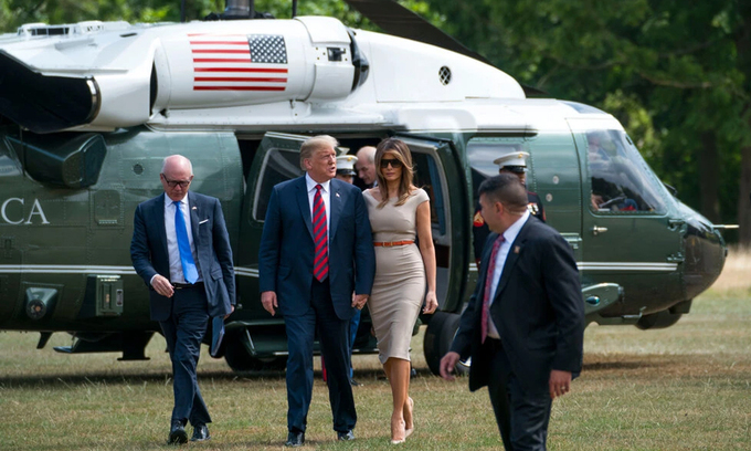 Đại sức Woody Johnson (trái) tháp tùng Tổng thống Trump và Đệ nhất Phu nhân Melania tại London năm 2018. Ảnh: NY Times.