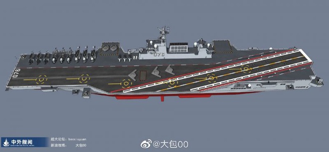 Nhà máy đóng tàu Trung Quốc lên kế hoạch đóng mới tàu đổ bộ Type-076 lắp hệ thống máy phóng điện từ để khởi động trực thăng và máy bay không người lái tàng h́nh.