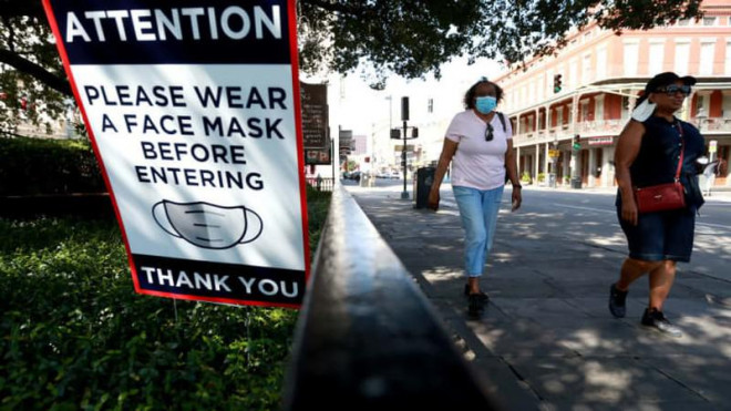 Biển cảnh báo đeo khẩu trang ở TP New Orleans, bang Louisiana (Mỹ) vào ngày 14-7. Ảnh: GETTY IMAGES