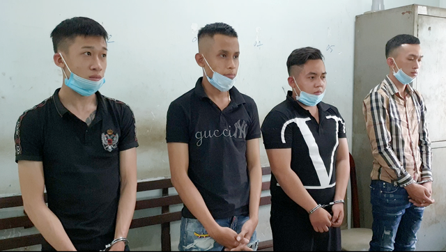 Từ trái qua, các đối tượng Tiến, Liêm, Phúc và Vinh bị Công an quận Bình Tân bắt giữ khi giật túi xách của chị L. khiến nạn nhân bị chấn thương sọ não