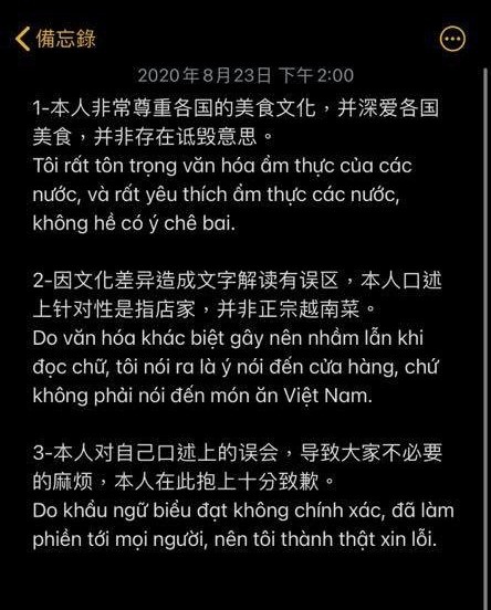 "Mọi người hiểu sai ư tôi rồi. Tôi đang nói về món của nhà hàng đó nấu, không phải món ăn chuẩn Việt Nam. Tôi rất yêu món ăn Việt Nam song đây là lần đầu tiên tôi ăn có mùi này, có thể là do nước mắm hoặc nguyên nhân khác, cũng có thể khẩu vị tôi không hợp. Tôi xin lỗi các bạn Việt Nam v́ phát ngôn của ḿnh", anh viết.