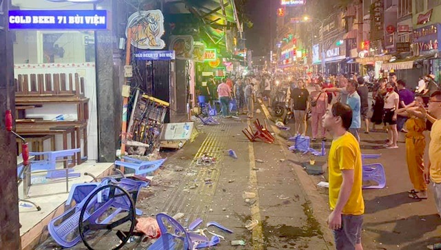 Chiếc xe này chỉ dừng lại khi tông một tủ điện và 3 xe máy khác. Ghi nhận, bàn ghế của các quán nhậu trên đường Bùi Viện bị húc văng khắp nơi.