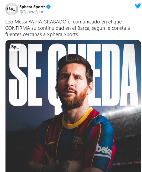 Sphera Sports đã thông báo trên tài khoản tweeter: "Leo Messi đã để lại một tuyên bố trong đó anh ấy XÁC NHẬN việc tiếp tục thi đấu tại Barca, theo nguồn tin thân cận của Sphera Sports".Theo Fox Sports và Sphera Sports, do gặp nhiều bất lợi nếu bước vào cuộc chiến pháp lý với Barcelona nên Messi sẽ "bất đắc dĩ" ở lại Nou Camp thêm một năm, sau đó anh sẽ gia nhập Man City để tái hợp với thầy cũ Pep Guardiola vào mùa hè tới theo dạng chuyển nhượng tự do khi hợp đồng của anh ở Tây Ban Nha đã hết hạn.