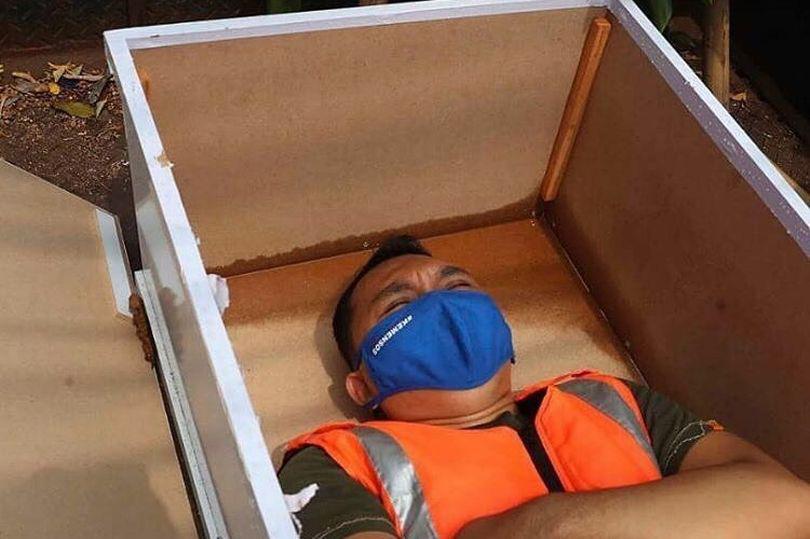 Những người bị bắt gặp không đeo khẩu trang phòng dịch Covid-19 ở Pasar Rebo, Đông Jakarta vào 2 ngày 2/9 và 3/9 đã được yêu cầu "suy ngẫm" về nguy cơ sức khỏe tiềm ẩn từ việc làm của họ khi nằm trong quan tài trong vài phút.