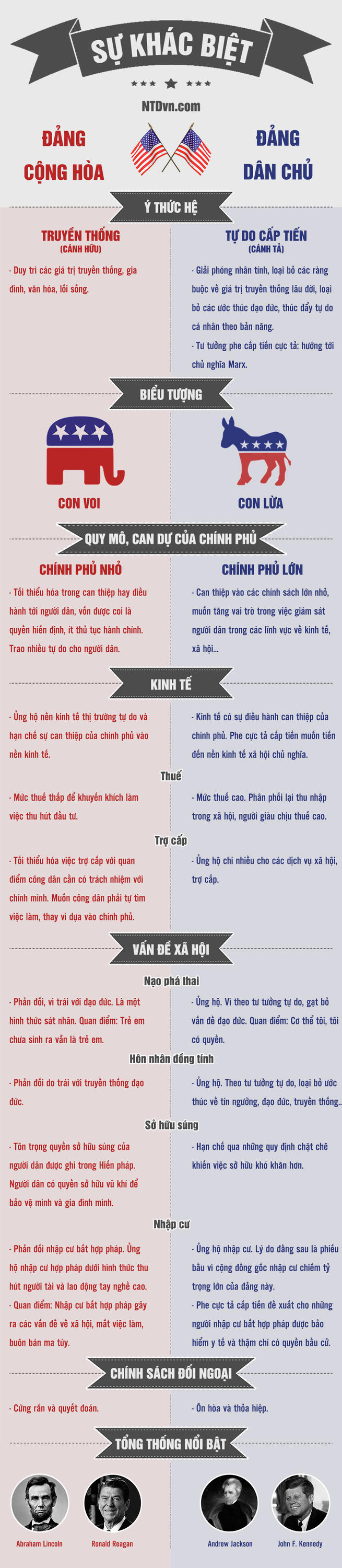 Khi nói đến bầu cử tổng thống Mỹ, người ta thường nghĩ đến sự ganh đua của hai đảng là Cộng hòa và Dân chủ. Vậy sự khác nhau căn bản giữa đảng Cộng hòa và Dân chủ trong chính trị Hoa Kỳ là như thế nào? Đặc biệt là các vấn đề đối nội của chính nước Mỹ. Dưới đây là một số khác biệt cơ bản giữa hai đảng này