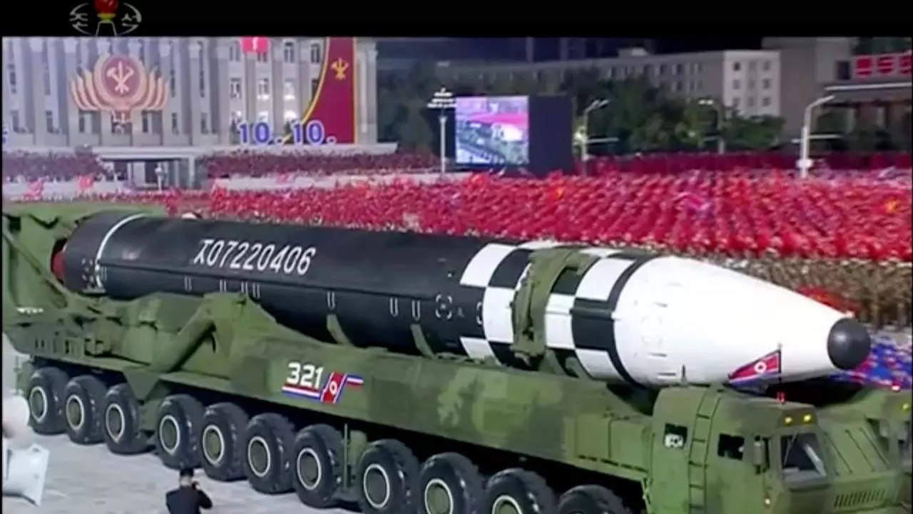 Ảnh chụp từ video do đài truyền hình Nhà Nước Bắc Triều Tiên KRT phát đi, cho thấy một chiếc tên lửa có thể là loại hỏa tiễn liên lục địa mới, trong cuộc diễu binh trên Quảng Trường Kim Nhật Thành ở B́nh Nhưỡng (Bắc Triều Tiên) ngày 10/10/2020. AP