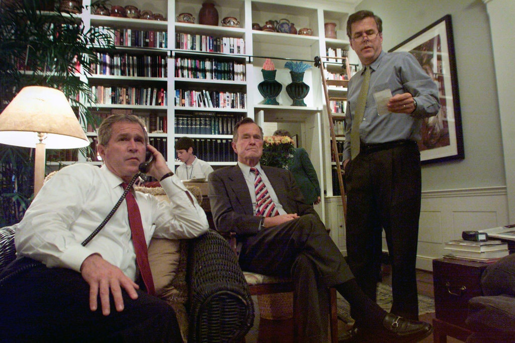 Ông George W. Bush theo dơi kết quả bầu cử cùng cha và em trai Jeb Bush, tháng 11/2000. Ảnh: New York Times.