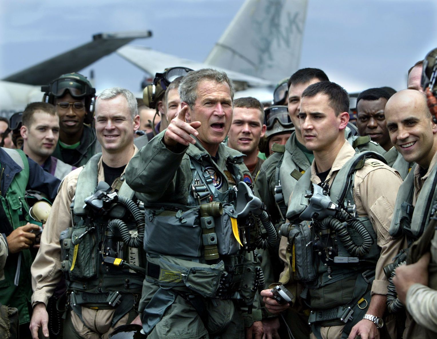 Nhanh chóng đánh bại được quân đội Iraq, ông Bush phát biểu lạc quan trước các lính Mỹ trên tàu sân bay USS Abraham Lincoln tháng 5/2003. Nhưng tái thiết Iraq khó khăn và gây tổn thất sinh mạng hơn nhiều đối với nước Mỹ. Ảnh: Reuters.
